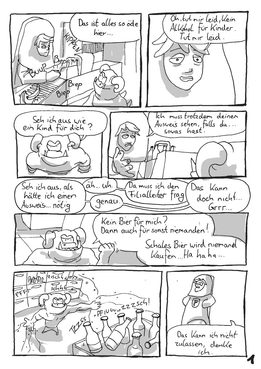 Außerdem finde ich es witzig, dass meine spontane Idee mit dem Supermarktkassierer im Endeffekt das Setting für unsere beiden Comics hergegeben hat. Das "Biep" der Kasse ist ja wie abgesprochen :D Ich finde es in jedem Falle gut, dass du teilgenommen hast; ohne deine Teilnahme, bei der du ja schon auf dein begrenztes Zeitbudget hingewiesen hast, hätte ich nämlich selbst nicht teilgenommen! Und es hat mir viel Spaß gemacht, diesen Comic zu zeichen. Insofern: Danke für diesen Kampf, verehrter Kontrahent! :thumbup: