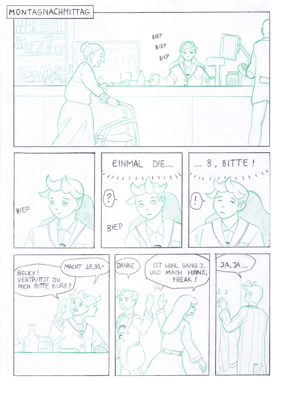 @bene: Eine interessante Anmerkung, dass die Kürze den Comic "fertiger" macht. Kannst du das noch genauer erklären? Von den Zeichnungen her hätte es mir eingeleuchtet, weil Buntstift in so einer Scan-Qualität schon mal per se nicht allzu "fertig" wirkt, und ich ja auch hier und da noch Spuren vom Zeichnen drin habe...