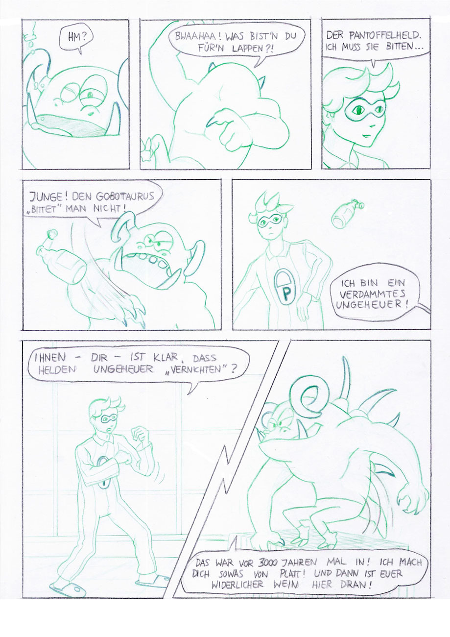 @Leo: Ich finde deine Auffassung vom Pantoffelhelden klasse. Er wirkt total überfordert, und dann dieses eine Heldenposenpanel - und dass er mit Pantoffel an der Kasse sitzt :D Deine Pantoffeltierchen sind auch hervorragend, vor allem mit deinen grauen Schatten; damals im Bio-LK hätte ich das wohl auch noch besser gekonnt ;) Ich möchte nur mal nachfragen, ob du dem Pantoffelhelden im 2. Panel dicke Lippen gezeichnet hast, oder ob eine Zahnreihe ist.