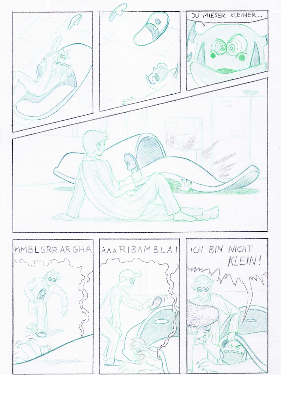 Die beiden Beiträge sind kaum zu vergleichen. Bei Der Leo gefällt mir das Lockere mit den klecksigen Grauflächen, bei Qualle das Steife, weil das in einem Actioncomic eine eigenartige Wirkung hat. Allein die grafische Umsetzung des Pantoffelhelden ist schon ziemlich schräg. Den Mangastil beim Kopf des Helden mag ich nicht so, aber passt ganz gut.