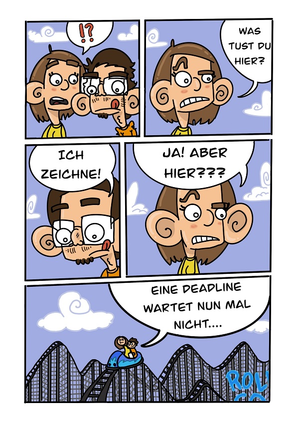 Beim dritten Comic hast du im ersten Panel ein zwei kleine Stellen vergessen zu kolorieren - kann passieren :D