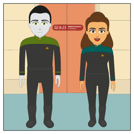 Über die Jahre habe ich meine eigene Technik entwickelt. Ich zeichne alles als Vektorgrafiken und kombiniere die einzelnen Elemente dann so ähnlich, wie Animationsfilme klassischerweise produziert wurden. Als Genre habe ich mich jetzt für eine von Raumschiff Enterprise - Das nächste Jahrhundert inspirierte Science-Fiction-Parodie entschieden. Zum einen war ich immer ein sehr großer Fan, zum anderen kann ich Figuren immer noch am besten genau von vorne zeichnen, was mich doch etwas einschränkt. Bei Star Trek kommunizieren die Darsteller jedoch sehr häufig per Videochat, sitzen im Shuttle, stehen nebeneinander auf einer Transporterplattform oder im Turbolift, gehen den Gang entlang oder sind aus anderen Gründen häufig von vorne zu sehen. Weil alle Uniformen tragen, muss ich außerdem nur die Gesichter neu zeichnen und kann die Körper immer wieder für die verschiedensten Figuren verwenden.