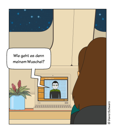 Theta ist in dieser Geschichte unterwegs auf einer Konferenz. Weil er seinen Kater Wuschel vermisst, fragt er bei Sheanna, die auf ihn aufpasst, nach, wie es ihm geht.