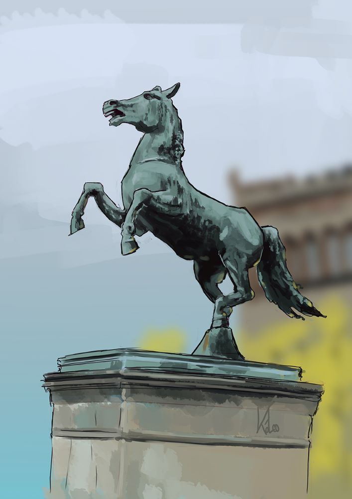 Zur Herstellungstechnik: Ich hab mich gefragt, ob du wohl solche Motive wie die Statue des Pferdes auch mal direkt vor Ort abzeichnest - mit einem Tablet zum Beispiel - oder ob die in jedem Fall auf dem Cintiq entstehen, und du die Vorlage vor Ort knipst.
