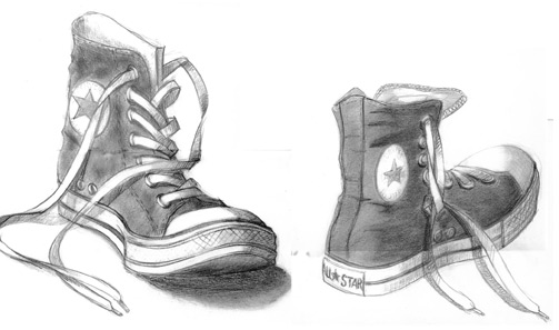 Hab noch ein Bild für euch. Mal was Nixcomicmäßiges. Hab ich in der Schule in Designzeichnen gemacht. Aufgabe: Schuh ausziehen und zeichnen. Wir hatten sieben Schulstunden Zeit, wobei ich ungefähr fünf Schulstunden gezeichnet hab und die anderen zwei gelabert o. ä.