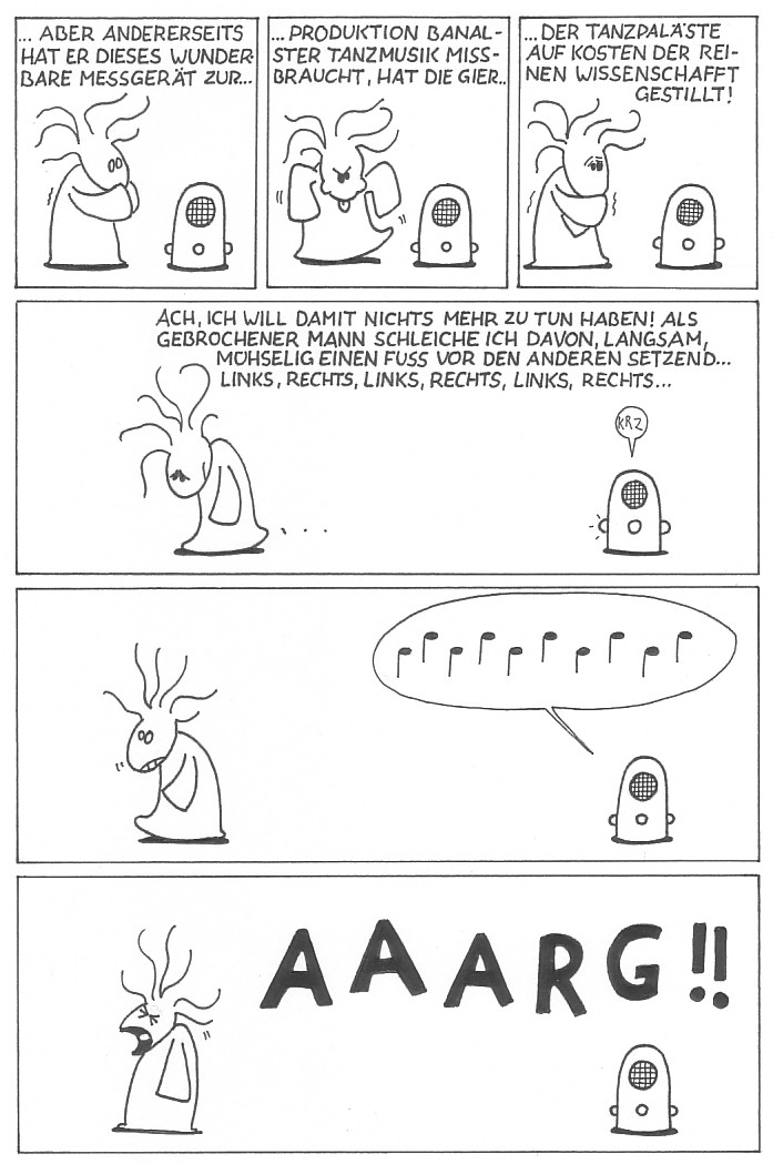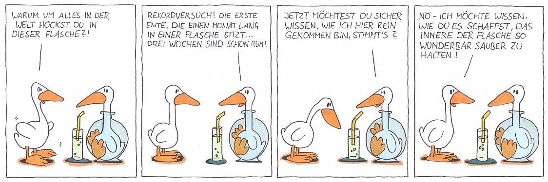 So, nun habe ich zwei Monate lang brav jeden Tag einen Comic-Strip gezeichnet, um die Vorratskammer wieder aufzufüllen, und kann ab heute beruhigt auf den normalen "zwei-Strips-pro-Woche-Rhythmus" umsteigen. Da werde ich dann hoffentlich auch Zeit haben, andere Dinge zu zeichnen... Daher mache ich hier mal einen Thread auf, wo ich diese aktuellen Sachen reinpacken kann. (Der Stapel altes Zeug, der hier neben dem Rechner liegt, landet in der schon existenten "Rumpelkammer", sobald ich mal Zeit habe.)