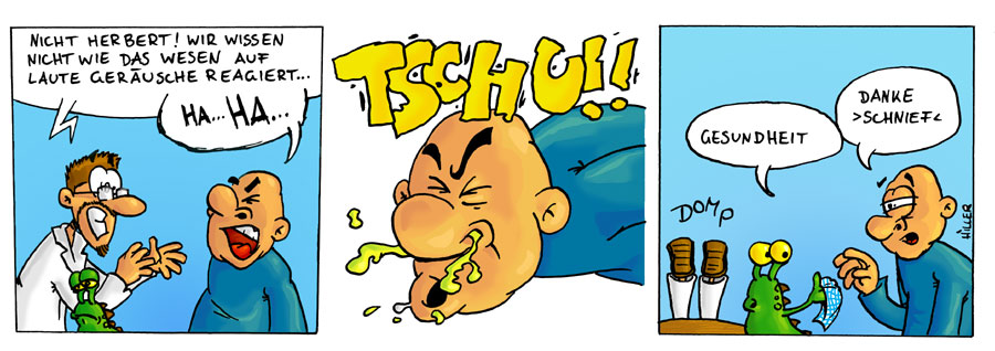 Die Schleimeruption im zweiten Bild. Wenn der Zeichner/Autor auf ein Detail so großen wert legt, erwarte ich als leser eigentlich, dass dieses Detail im Schlussbild eine wichtige Rolle spielt; das tut es bei dir nicht, und daher war ich etwas irritiert.