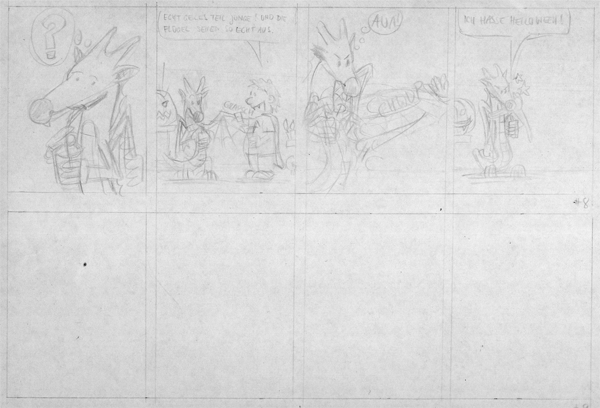 Wenn mir eine Stripidee dann gefällt, zeichne ich proportional den selben Rahmen auf ein A3 Blatt und zeichne dann die Idee ins Reine.