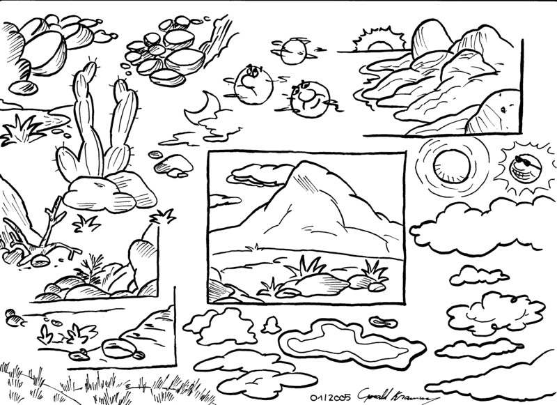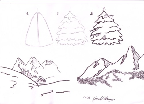 Deshalb habe ich drei Blätter mit verschiedenen Grundlagen der Comiclandschaftszeichnung angefertigt. Wer möchte, kann damit verschiedene Bilder zeichnen, vielleicht nutzt ihr die Abbildungen abgewandelt in euren Comics oder ihr holt euch einfach Anregungen - ganz wie ihr wollt.