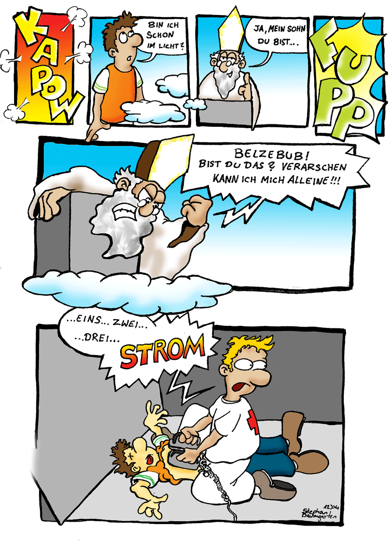 Im letzten Bild, das rechte Bein des Sanis (oder Arztes). Wenn er sich wirklich so über den Patienten kniet, ist die Wahrscheinlichkeit, dass der Patient am Ende lebt und der Sani den Löffel abgibt sehr hoch. :D