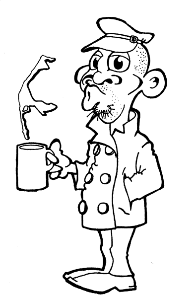 Seine Körperhaltung....besser gesagt, die Fußstellung wirkt steif. Hätte er nicht schon ein lecker Heissgetränk in der Tasse, würd ich sagen er steht in einer Schlange an, um an ein Gesöff zu kommen. (der Satz is bissl lang geworden :rolleyes: )