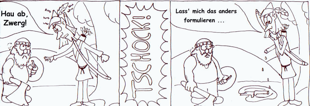 Wie man an diesem Strip vielleicht sieht, hab ich noch Probleme, Bewegungen in die Bilder einzubauen. Da fehlt mir noch einiges an Übung.
