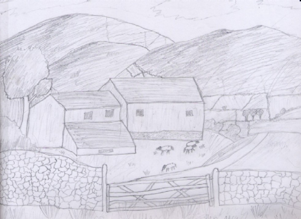 ich gebe hier mal eine perspektivische Grausamkeit zum Besten (und damit dem Forum-Gelächter preis). Das hab ich mit 11 fabriziert, als ich Tag und Nacht versucht hab, Landschaften zu zeichnen :rolleyes:.