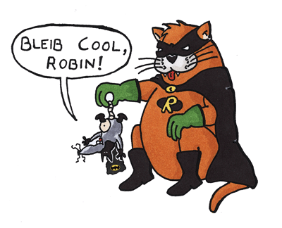 Sehr gut! Eine Ratte mit Idenditätsproblemen. Schöne Zeichnung! Ich finde den Sprechblasenstrich gut wie er ist, damit keine Mißverständnisse aufkommen, weil man denkt, die Katze würde es sagen.