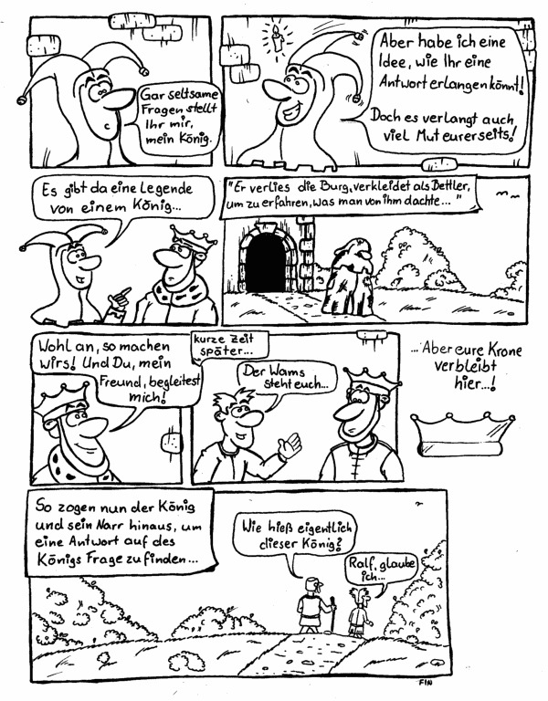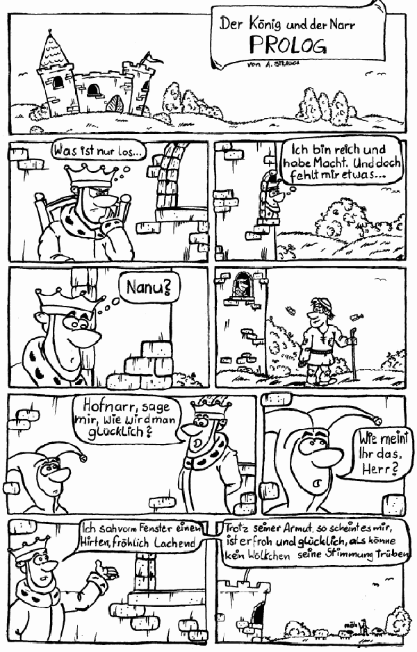 - Die Bilder wirken oft wie Illustriationen zum Text?! Hm, weiss nicht, wie ich das erklären soll... Na ja, fünftes Bild: Wenn du da den Hirtenjungen wirklich glücklich zeichnest (Schaut lachend einem Schmetterling nach, füttert glücklich grinsend eines seiner Schafe mit was leckerem - irgendwie so :)), kannst du den Text weglassen und danach ein Bild anhängen, das den König mit leicht leerem / verblüfftem Gesicht zeigt, und dann das Bild mit der Frage an den Narren anschließen. Dann wäre über die Bildebene klar, dass der König das Hirtenjungenglück bemerkt hat und darüber nachdenkt - ich denke, das gäbe eine bessere Balance. Im letzten Bild wäre es ähnlich.