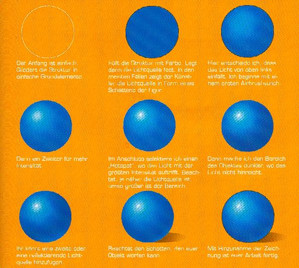 Erst eine etwas hellere Farbe auf die Zeichnung auftragen (halt da, wo das Licht hinfällt), dann einen noch helleren Ton darüber und zum Schluss wähl ich einen kleinen Teil mit dem Lasso aus und fülle ihn mit einer ganz hellen Farbe. (Hab unten mal angehängt, wie das im Buch beschrieben wird)