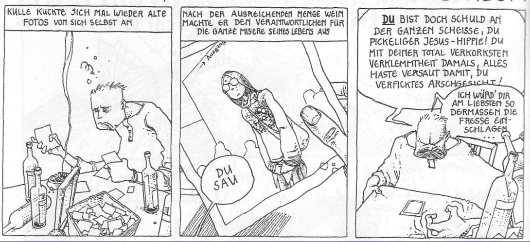 Ja, an sowas denk ich auch. Hab mich drei Jahre lang von dieser Frau verarschen lassen, meine Fresse! Waren sicher viele schöne Tage in dieser Beziehung, aber die Tatsache, dass sie stets zwei Freunde brauchte, machte die Sache doch etwas anstrengend. Hätte ich doch nur mal rechtzeitig irgendjemanden gehauen anstatt wie blöd auf die Frau einzulabern!