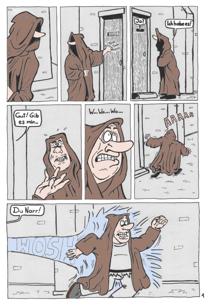 Die Geschichte entsteht wärend sie gezeichnet wird. Ich weis also selber nicht was passieren wird. Die erste Seite so wie sie oben steht ist eine arbeit von 3 Wochen. Dafür ist schon unmengen Papier, Bleistifte und Radierer ums Leben gekommen...