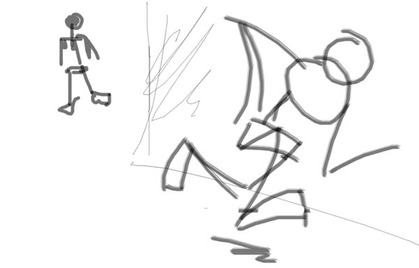 Der Körper aber müsste meiner Meinung nach viel stärker in Bewegung sein. Du musst dir vorstellen, dass er auf der Flucht ist und angst um sein Leben hat. Der Körper beugt sich extrem nach vorne. Unterkörper und Oberkörper sollten auf einer Höhe sein.