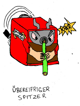 Ich musste kurz nachdenken, allerdings nicht, weil der gag schlecht wäre, sondern, weil die glühbirne aussah wie ne schlinge mit sonne im HG. Mach das gelbe einfach bis auf das innerhalb der glühbirne weg! Ansonsten nicht der reisser aber ok. Wenn man meine ersten bedenkt...