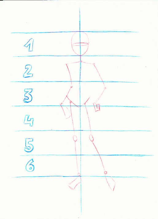 Ich beginne immer mit einer Strichmännchenzeichnung um die Pose grob festzulegen. Die wichtigen Gelenke markiere ich dabei mit kleinen Punkten oder Kreisen. Wie ihr an den waagrechten Linien seht ist mein Strichmännchen 6 Köpfe groß (manchmal auch etwas mehr, je nach dem). Ich habe die Linien hier sehr deutlich eingezeichnet, damit es leicht erkennbar ist, aber auch wenn ich einfach nur so zeichne unterteile ich die Figur mit kleinen Punkten oder Strichen in ihre Kopfgrößen. So ist es am einfachsten die Proportionen einzuhalten.