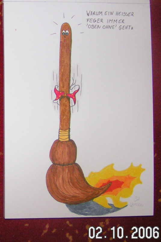schöne Zeichnungen machst du da. Bei dem "Wegwarten-Gag" habe ich aber auch erst ziemlich überlegen müssen, und ich glaube nicht, dass ich da draufgekommen wäre, wenn ich die anderen Beiträge hier noch gelesen hätte. Was mich an deinen Zeichnungen etwas stört, ist, dass immer so groß ein Datum vom PC (Kamera) drinnen steht und so ein Rand herum ist. Hast du die Zeichnungen fotografiert, um sie hier reinzustellen? Sieht so aus, dann wird es aber auch nicht anders gehen. Aber das kommt schon noch alles. :) :D