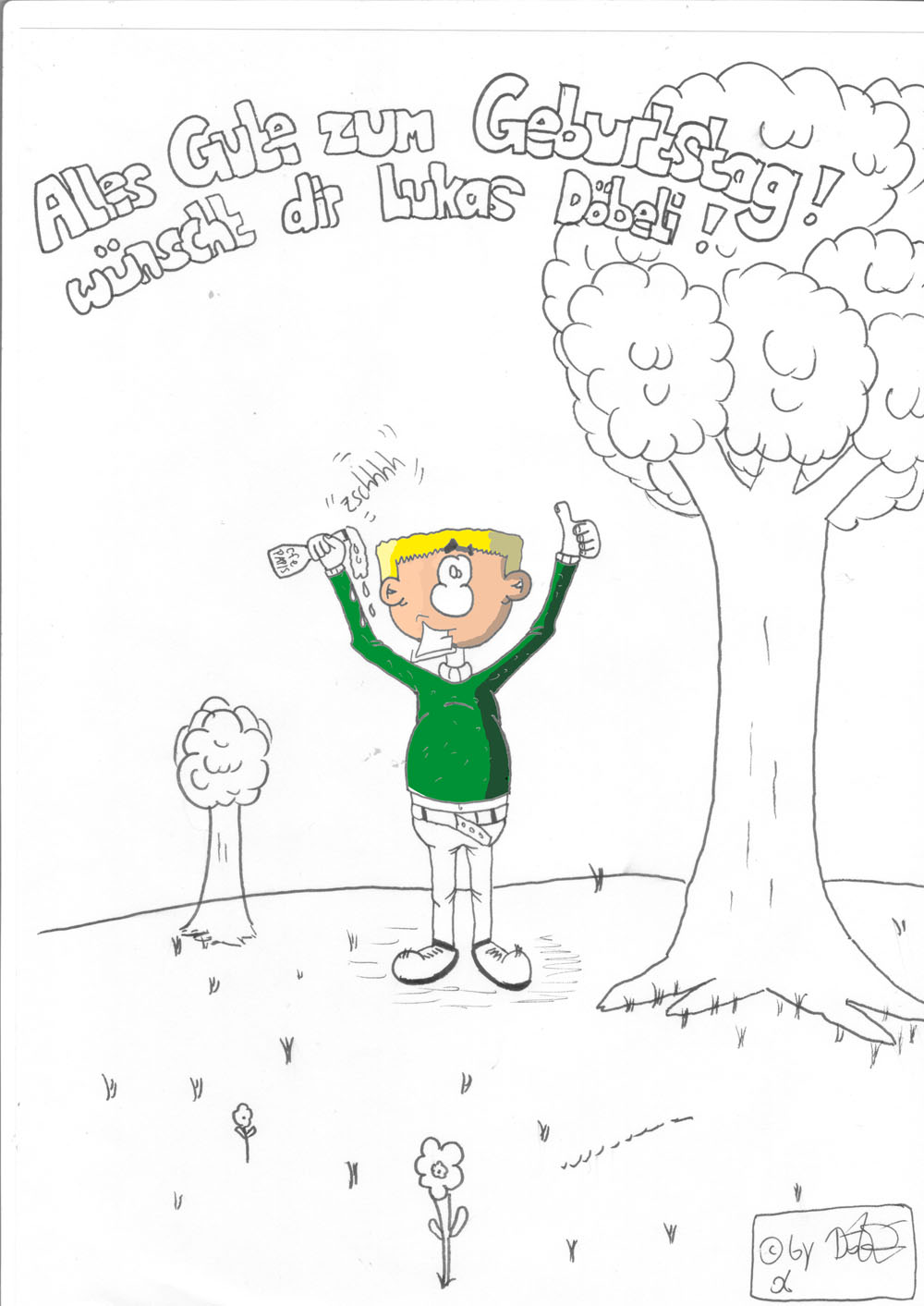 Tolle Idee für ne Geburtstagskarte, schön gezeichnet. Bin mal gespannt wie sie komplett coloriert aussieht. :)