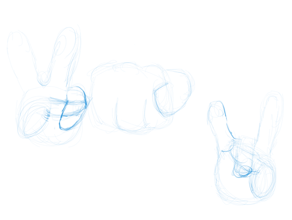 Zu der Skizze, Ich hab mir für heute vorgenommen, mal wieder ein bisschen Händezeichnen zu üben, weil ich das doch ja nicht so gut kann. Ich hab den Händen hier bewußt nur 4 Finger gegeben, weil ich denke, dass das besser zu meinem Stil passt. Doof ist daran natürlich, dass man bestimmte Posen, z.B. "Rock!" (rechts), so nur schwer umsetzen kann. Mal schaun...
