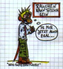 Also erstmal find ichs ziemlich cool, dass du einen festen Charakter hast. Ich würde das Ganze nur langsam aufhören auf karierte Blätter zu zeichnen, dass macht es nämlich unprofessioneller was deine Bilder nicht verdient haben ;) Das Plakat würde ich nicht ganz so grade sondern authentischer, indem du es etwas mehr von der Seitenansicht zeichnest (vllt auch ein paar Linien zur Raumaufteilung andeuten) bringen. Und noch eine Frage, wie groß ist das Bild ungefähr im Orginal?