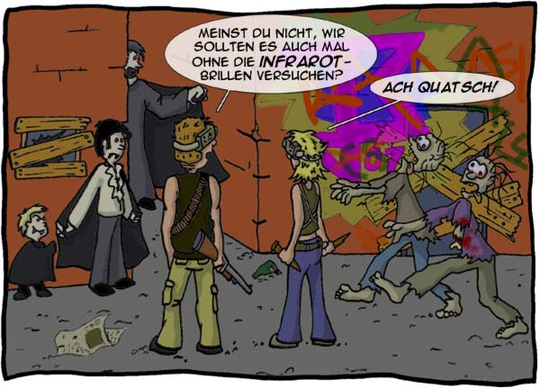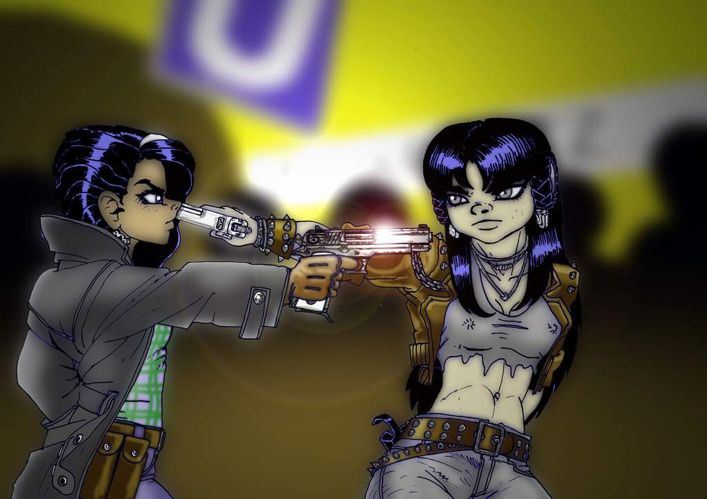 WAAHHH! Der ist gut! Saugut sogar! Kann ich mir den Gag für unsere VAMPIRE-Runde ausleihen? Da versuchen auch gerade ein paar, eine Vampirjägertruppe zu gründen! Hmmm... was Vampire angeht, da hab´ ich auch noch was - eine Pattsituation in der U-Bahnstation - die mit der hellen Strähne ist Marlo - eine Hunterin - und die andere ist Diane, ein Vampir (alles etwas Underworld-mäßig).