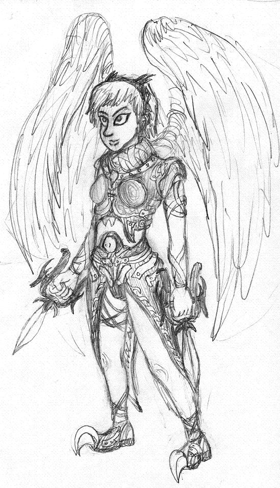 sers, hier mal eine idee von einer geflügelten auftragsmörderin. die ganzen details können einem schon graue haare bringen meine fresse.