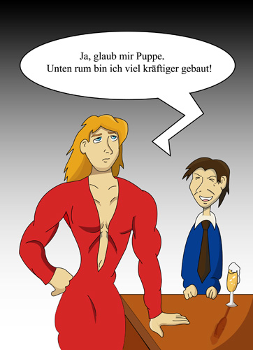 Also beim zweiten musst ich richtig lachen :-), aber trotz Ausschnitt sieht "Puppe" nicht wie eine Frau aus. Den ersten Toon find ich auch sehr schön, aber mir ist die Theke zu sehr mit nem Lineal gezogen. Sieht etwas steril aus.
