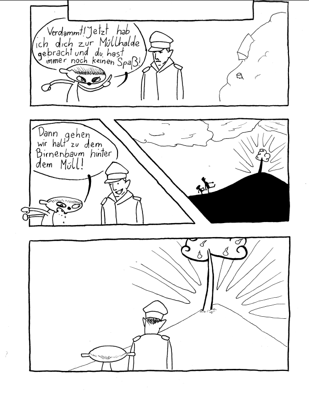 Ich bin sehr gespannt auf einen Titel und eine Fortführung der Geschichte wenns überhaupt eine gibt. Achja, der Müllhaufen könnte Details vertragen. Man kann sehr lustige Gegenstände in einen Müllhaufen zeichnen.