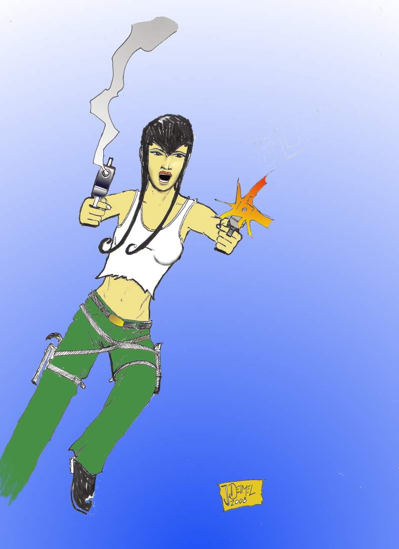 vom prinzip net schlecht, schöne zeichnung, farben passen auch, aber die ganzen kleinen weissen ränder (vor allem an der hose schauen net so gut aus. die verschwommenen übergänge (-->brust) gefallen mir auch net so, aber das ist, denk ich, geschmackssache. ach ja und sind die kleckse im hintergund, also das weisse ich glaube sogar buchstaben zu erkennen) absicht?