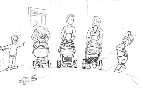 Die Rohzeichnung finde ich sehr gut, die Idee gefällt mir auch. Und das Wort "Kinderwagenschubser" könnte es treffender nicht beschreiben. :D