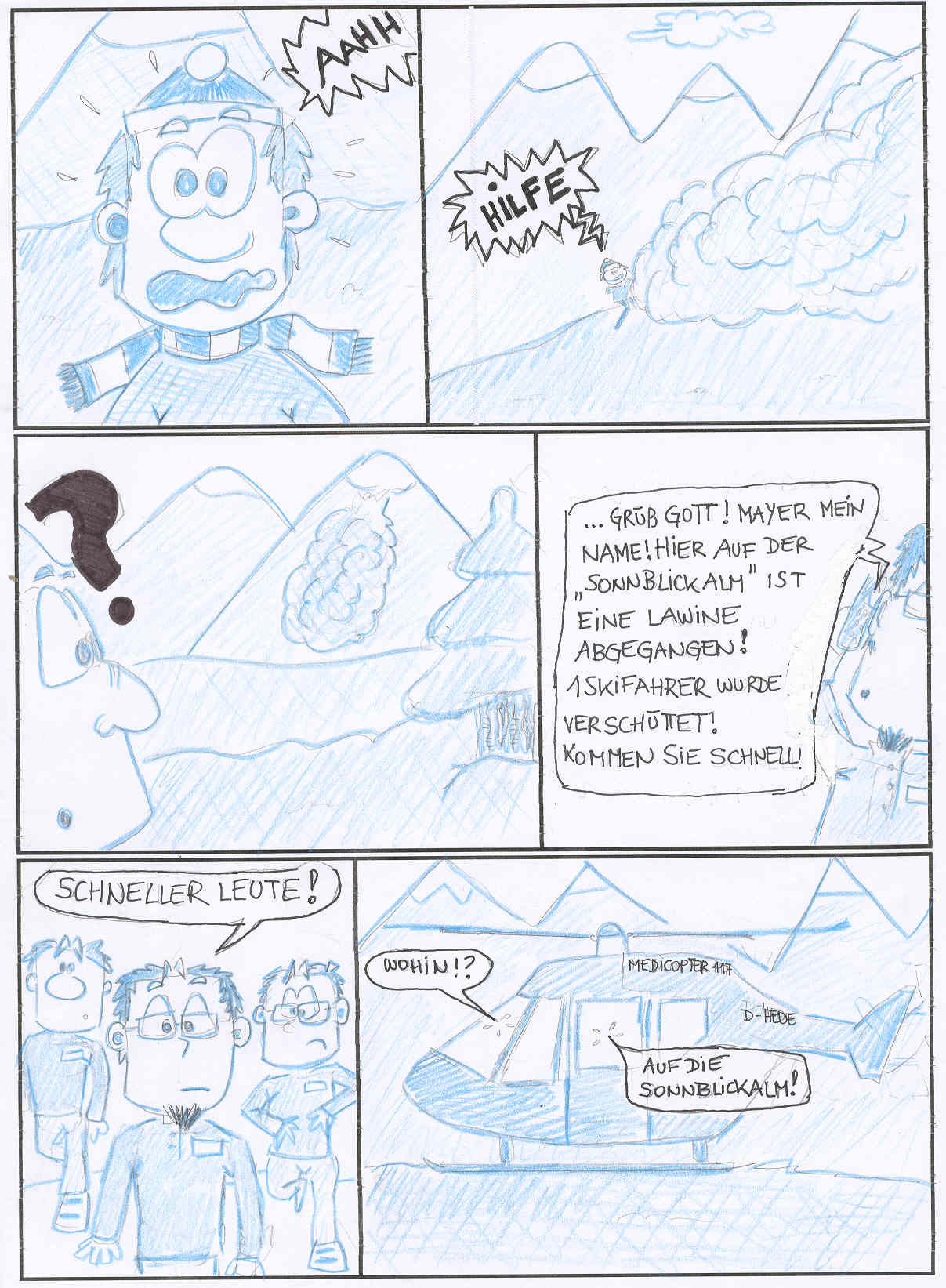Wenn Du noch dran feilen willst, könntest Du noch z.B. in Panel 5 ein paar Speed-Striche und eine Staub-, äh Schneewolke reinbasteln, daß der Typ gerade über die Klippe gehüpft ist.