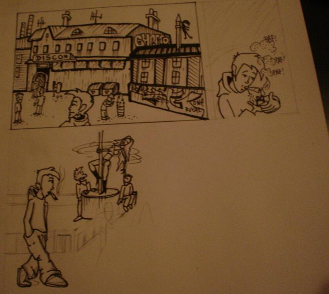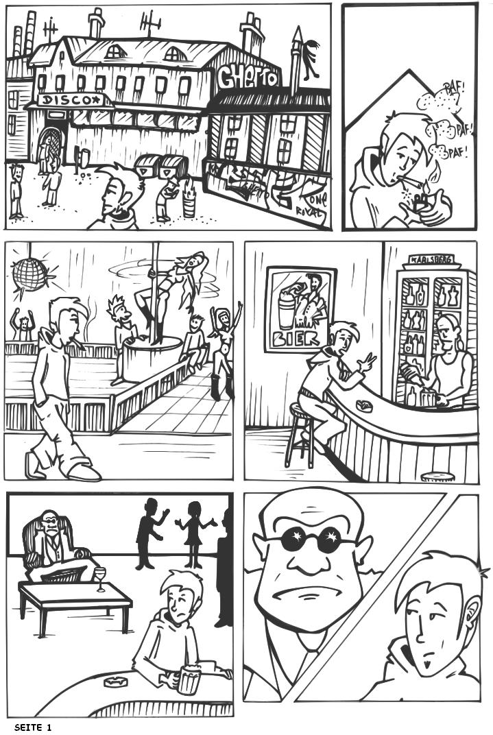 JUHUUU 2 neue seiten fertig!!! die seiten haben nichts mit einander zu tun. es ist jeweils die erste seite einer stroy. gimme kritik. das vorletzte bild von der ghetto- story gefällt mir nicht. das von der bar aus gesehen. wie kann ich eine person im hintergrund (am tisch sitzend), in einer disco darstellen.