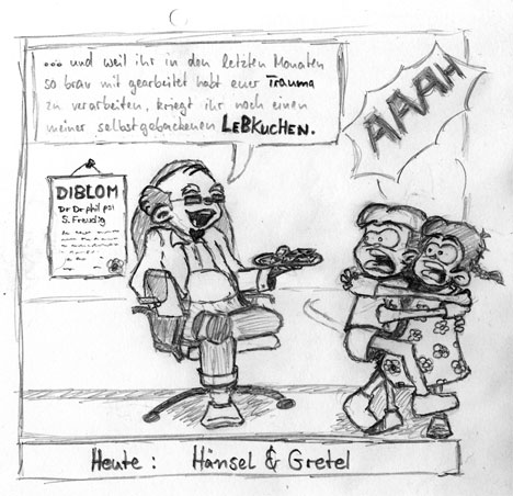 Ich würde die Bildunterschrift weglassen und den guten Doktor die beiden mit Hänsel und Gretel ansprechen lassen. Wenn sich die beiden noch hinter einer Couch vor dem Onkel Doktor mit den Lebkuchen verstecken würden...