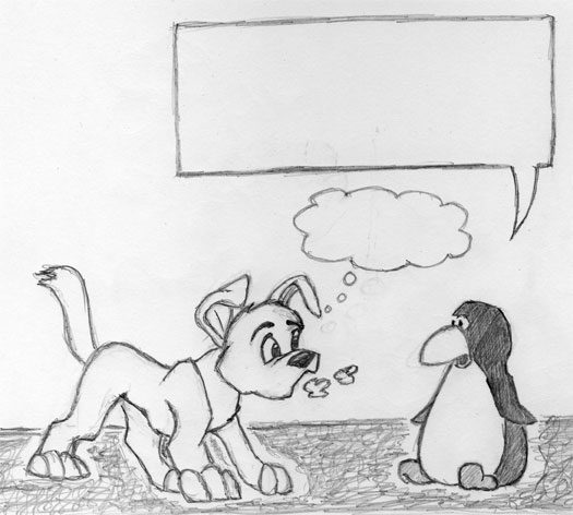 Süße Zeichnung, dennoch habe ich auch ein paar Kritikpunkte die mir aufgefallen sind. Zum einen wie Chaale schon schrieb der Fuß. Was mir noch aufgefallen ist, dem Hund fehlt ein Stück vom Maul (fast unter der Nase) und die Füße des Pinguins wirken etwas eigenartig.