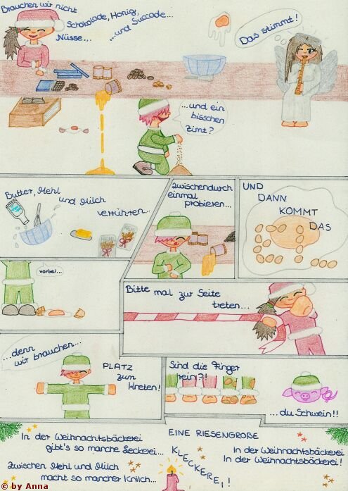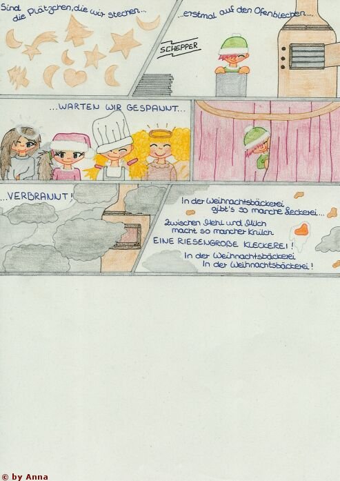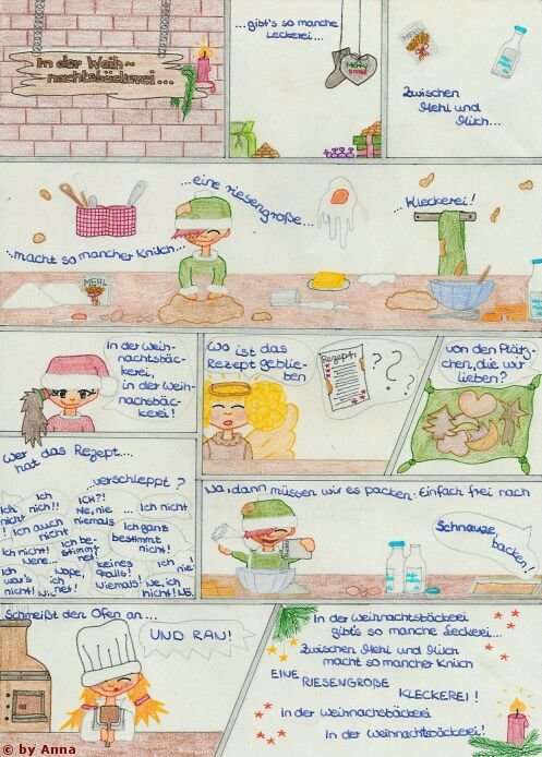 Bin neu hier und habe auch erst vor kurzem mit dem Comic zeichnen angefangen. Trotzdem will ich euch mal eins zeigen, was ich Weihnachten gezeichnet habe. Meine Oma wollte den Text von "In der Weihnachtsbäckerei" und dann hab ich ihr den als Comic geschenkt. Ist aber mit Buntstift coloriert *lg* :))