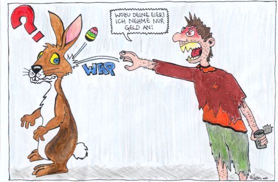 Also du hast schon gute Elemente in deinem Bild! Zum Beispiel die Bewegung des Eies oder den Gesichtsausdruck des Typen. Auch die Farben passen, sie sind nicht zu grell und lenken nicht unnötig ab. Allerdings musst du noch an deiner Anatomie feilen. Die Hand bei der Dose schaut nicht gut aus. Er steht auch etwas steif da und bei der Hose weiss ich nicht ob sie von vorn oder von hinten gezeigt wird.