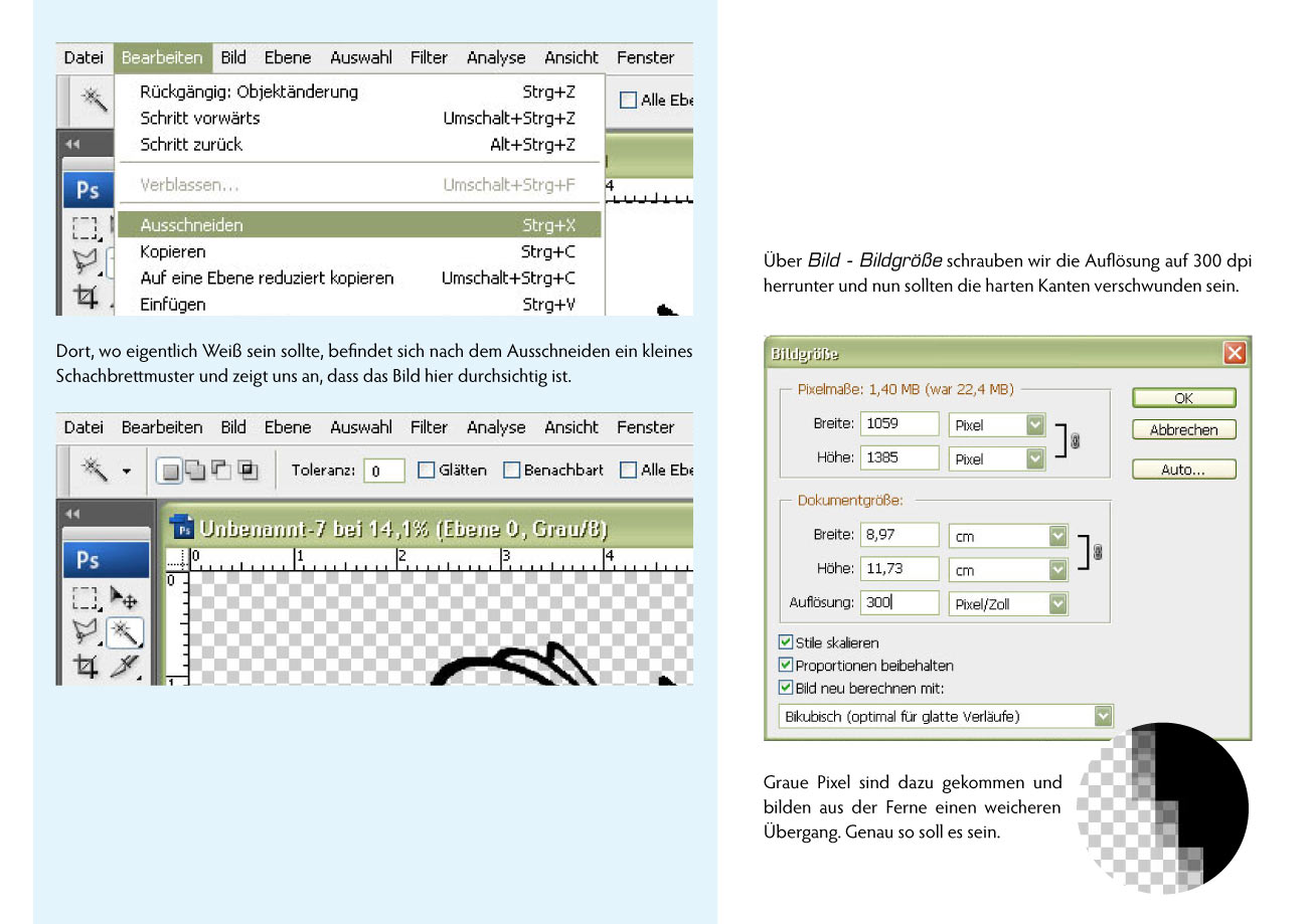 Danach könnt ihr das Bild verkleinern. Von den eingescannten 600, 1200, etc. am besten auf 300 dpi, das ist zum Kolorieren optimal. In Photoshop geht ihr dazu auf Bild > Bildgröße, in GIMP heißt es "Bild skalieren".