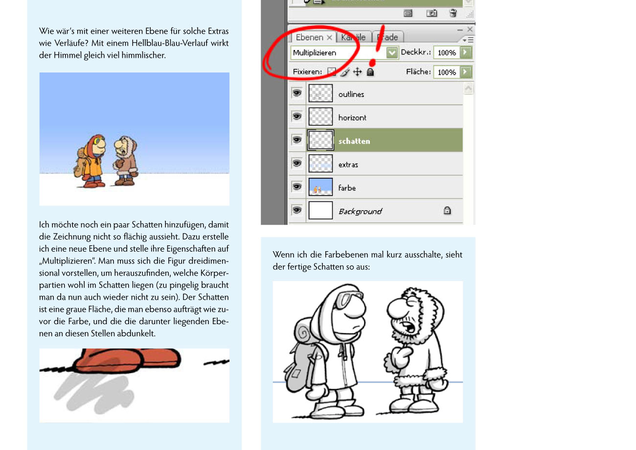 Jetzt fängt endlich der richtige Spaß an. Bevor ihr allerdings wild auf eurer Zeichnung herummalt, müsst ihr über das Mysterium "Ebenen" bescheid wissen. Ebenen werden immer gerne als eine Art aufeinander liegende Folien beschrieben. Ihr könnt auf ihnen herumpinselt, ohne, dass die darunter liegende Originalzeichnung beschädigt wird. Um eine neue Ebene zu erstellen, müsst ihr auf das kleine, papierähnliche Icon im Ebenenfenster klicken oder einfach über Ebene > Neu. Damit nun die Striche eurer Zeichnung durch die darüber liegende Farbe scheint, müsst ihr den Modus der neuen Ebene auf "Multiplizieren" stellen. Wenn ihr jetzt einen Strich auf der Kolorationsebene macht (ganz wichtig! NICHT auf der Hintergrundebene, auf der eure Zeichnung liegt) bleibt trotzdem die Schwarz-weiß-Zeichnung sichtbar.