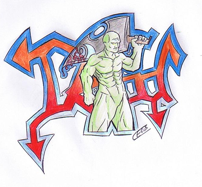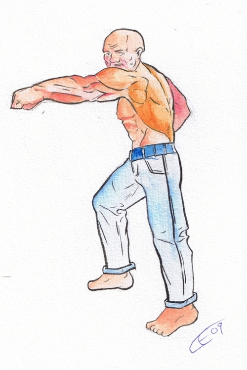 Der Muskeltyp ist auch super; obwohl sich ein, zwei Fehler eingeschlichen haben :D Dass der linke Arm inklusive Hand etwas größer ist als auf der rechten Seite, liegt wohl an diesem Monsterschwert, dessen Perspektive nach müsste aber sein Unterarm vor dem Unterarm sein und nicht umgekehrt. Die Bauchregion sieht gut aus, nur die Oberschenkel sind viel zu mächtig. So einen enormen Arsch, wie es das Ende des linken Beins andeutet, kann der auch trotzd des Schwertes nicht haben :D