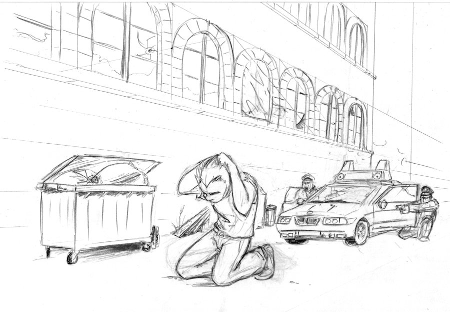 Ich finde, du solltest den Mülleimer noch größer machen, ruhig bis zur perspektivischen Linie, die oben durch das Polizeilicht geht.