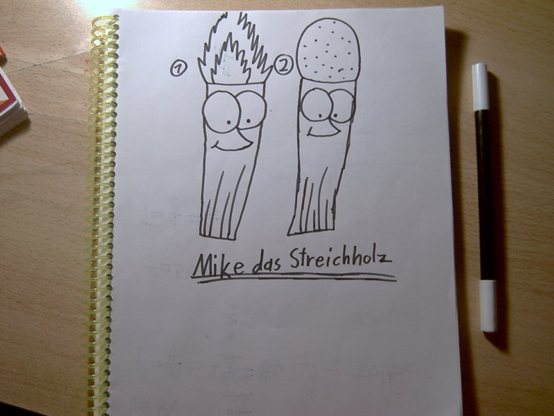 Ich würde dir allerdings empfehlen, den Typen etwas plastischer zu zeichnen. Ein Streicholz definiert sich ja hauptsächlich dadurch, dass es ein sehr kleiner Holzstecken ist, dessen Besonderheit in seinen Ecken liegt. Sonst könnte ja einfach jemand daherkommen und behaupten, er wäre lediglich ein Zahnstocher mit Badekappe, was seiner einzigartigen Natur wohl kaum gerecht würde.