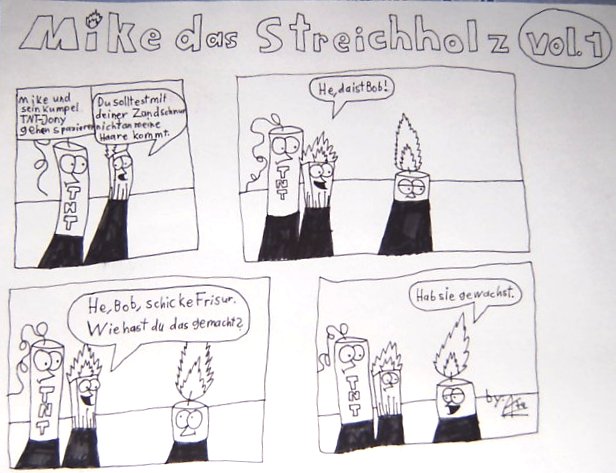So Kinnas, jetzt binn ich drann Sachen zu präsentieren, nämlich meinen (erst Gestern entstandenen) Kumpel Mike das Streichholz!!! ^^ Mike das Streichholz soll ein kurzer Comic-strip werden den ich wöchentlich hier im Forum präsentieren will. Doch wie gesagt ist er erst Gestern in einer sau-langeweiligen Erdkunde-stunde entstanden, deshalb werde ich hier zwei grobe Zeichnungen von ihm reinstellen und ihr könnt mir sagen (oder auch nicht :P ) welcher eurer meinung nach besser ist. So genug vom Vorblabla hier ist meine Zeichnung: