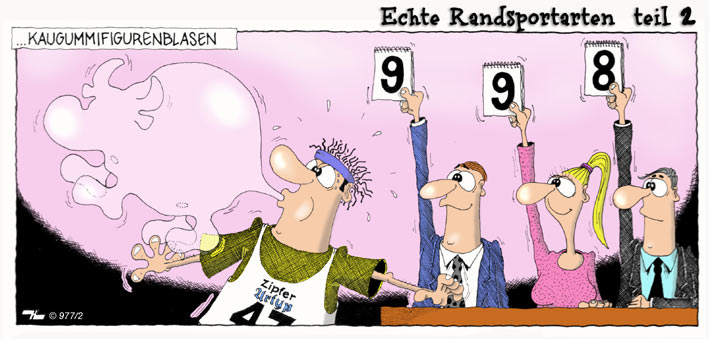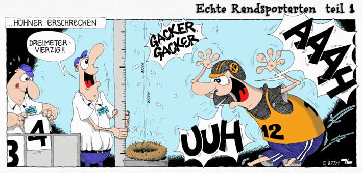 Den ersten mit dem Hühnererschrecken find ich am besten, weil er irgendwie völlig sinnfrei ist. An den Cartoon mit dem Blöd Rumstehen Wettbewerb musste ich diese Woche öfters denken, wenn ich durch die Stadt gegangen bin. Ich bin mir sicher, diesen Wettbewerb gibts wirklich und ich habe einige der Teilnehmer gesehen.