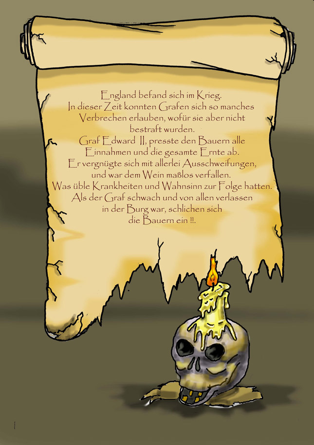 Ich denke auch, Du solltest die Story noch mal überarbeiten. Der Einstieg, die erste Seite war einfach zu geil. Das ganze jetzt so abzuwürgen finde ich schade. Die Idee mit dem schatz ist gut. Da könnte doch jetzt ein Finsterling auftauchen und ihn erpressen ,bedrohen, ihm einen Pakt vorschlagen oder es tauchen Geister aus der Vergangenheit auf (der Grund für den Wahnsinn des Grafen), oder...