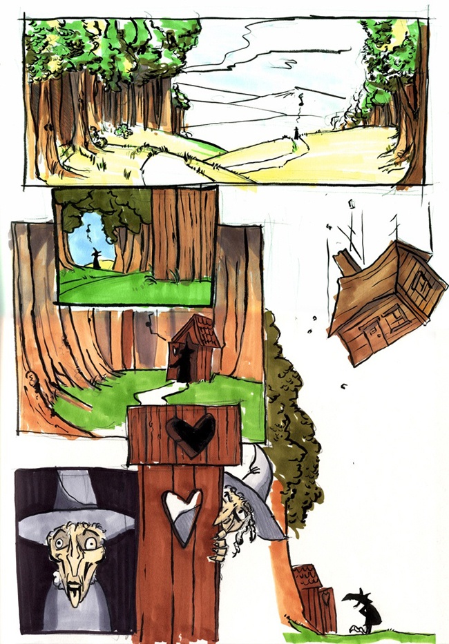 Es is übrigens das Intro zum "Zauberer von Oz" in meiner Interpretation. Wer die Story nicht versteht: es ist die böse Hexe, die eigentlich nur auf dem Weg zur Toilette ist. Das komplette Lettering fehlt noch, im Panel unten links müsste auch noch ein Soundword sein. Dort trifft sie quasi der Schlag, ein Blitzzucken, Donnergrollen und Dorothys Haus wird in die Welt von Oz versetzt. Die Hexe schaut nach und.....nun, bekommt geschätzte 25 Tonnen Holz, Nägel, Dachziegel, ein Mädchen und einen Hund auf den Kopf...